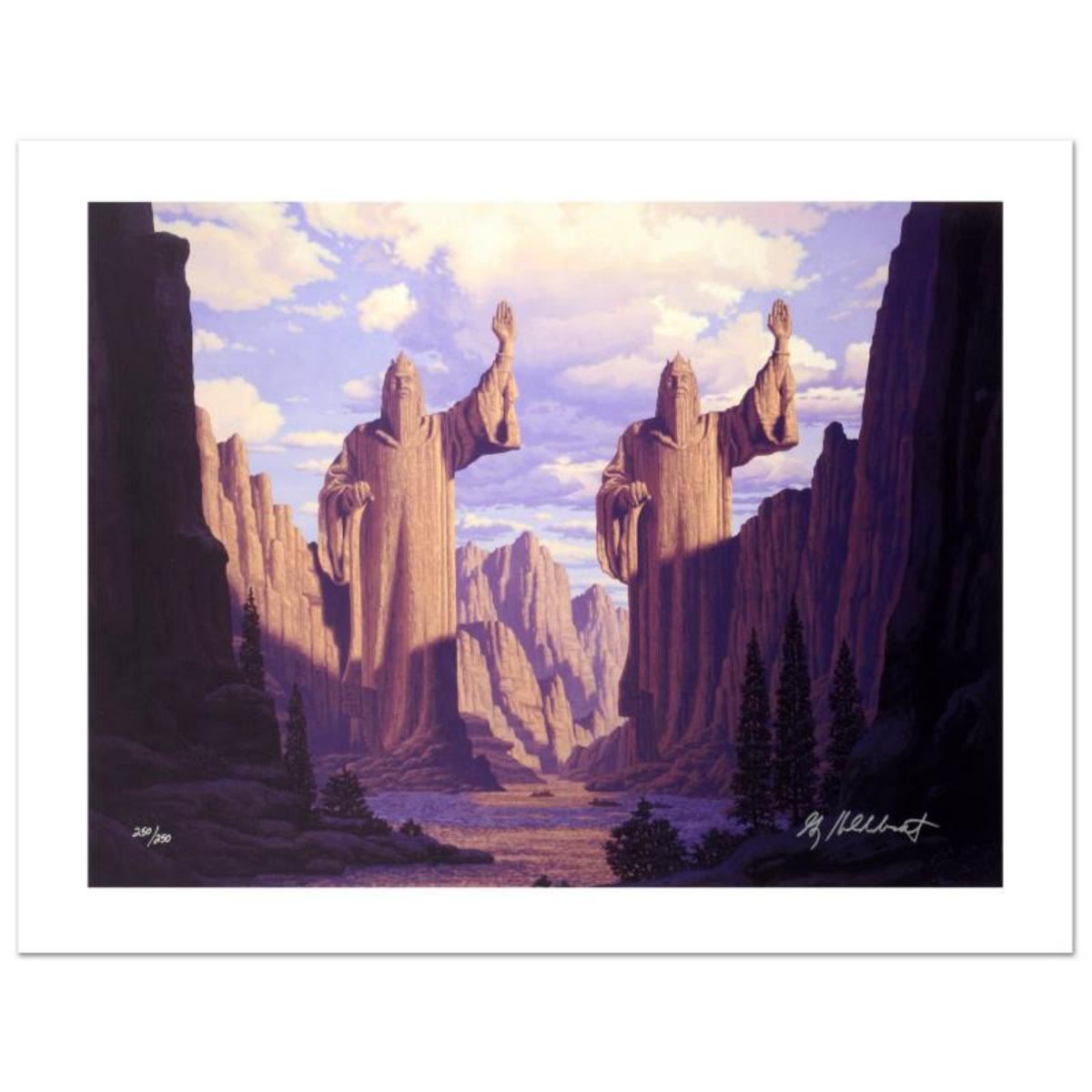 Known world wide for their fantasy and science fiction illustrations, identical twin brothers Greg and Tim Hildebrandt created an abundance of fascinating artwork, most notably their illustration work for J.R.R. Tolkien's 'The Hobbit' and 'Lord of the Rings'. "The Pillars Of The Kings", originally created in the 1970's for Ballantine Books, is a limited edition giclee on canvas, numbered and hand signed by Greg Hildebrandt! Includes Certificate of Authenticity! Measures approx. 28" x 21" (image). Reference #: 193686.