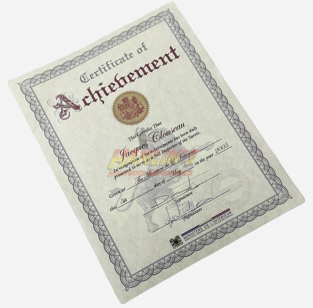 Original Certificate of Achievement for "Jacques Clouseau", played by Steve Martin in the comedy mystery film 'The Pink Panther' (2006), where, bumbling Inspector Clouseau must solve the murder of a famous soccer coach and find out who stole the infamous Pink Panther diamond.