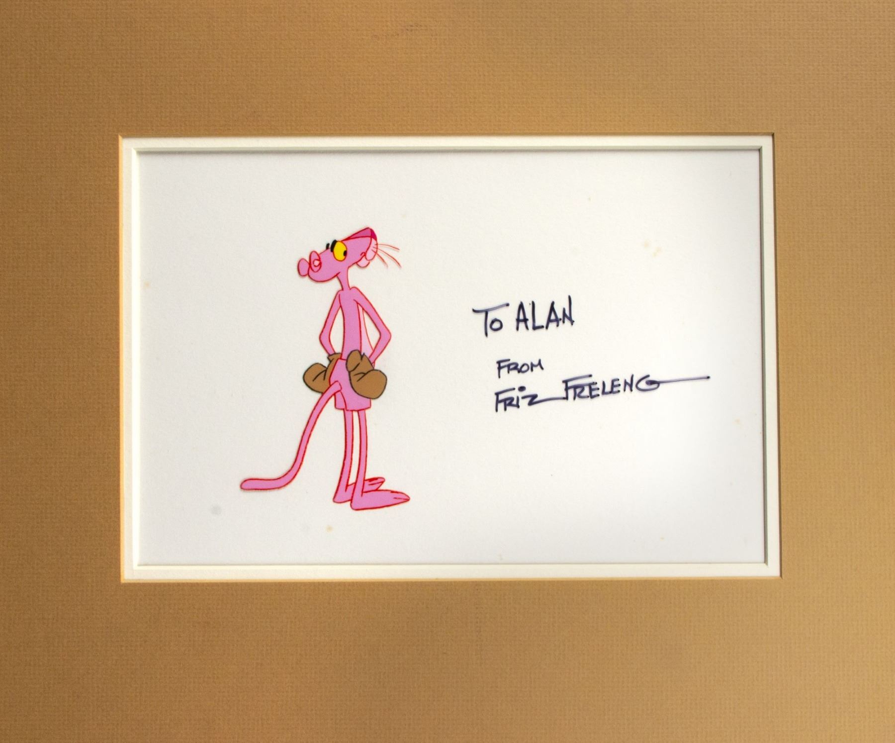 (DePatie-Freleng, c.1970s) An original animation cel from "The Pink Panther Show" animated series. Featuring an image of The Pink Panther, this hand-painted cel is hand-signed by legendary director Friz Freleng, who along with David DePatie, founded DePatie-Freleng Enterprises which produced the series. The character‘s image measures 5"x3.25" on its 10.5"x12.5" cel sheet, which is matted. The condition is very good, with some small chips to the bottom-left corner of the cel sheet.
