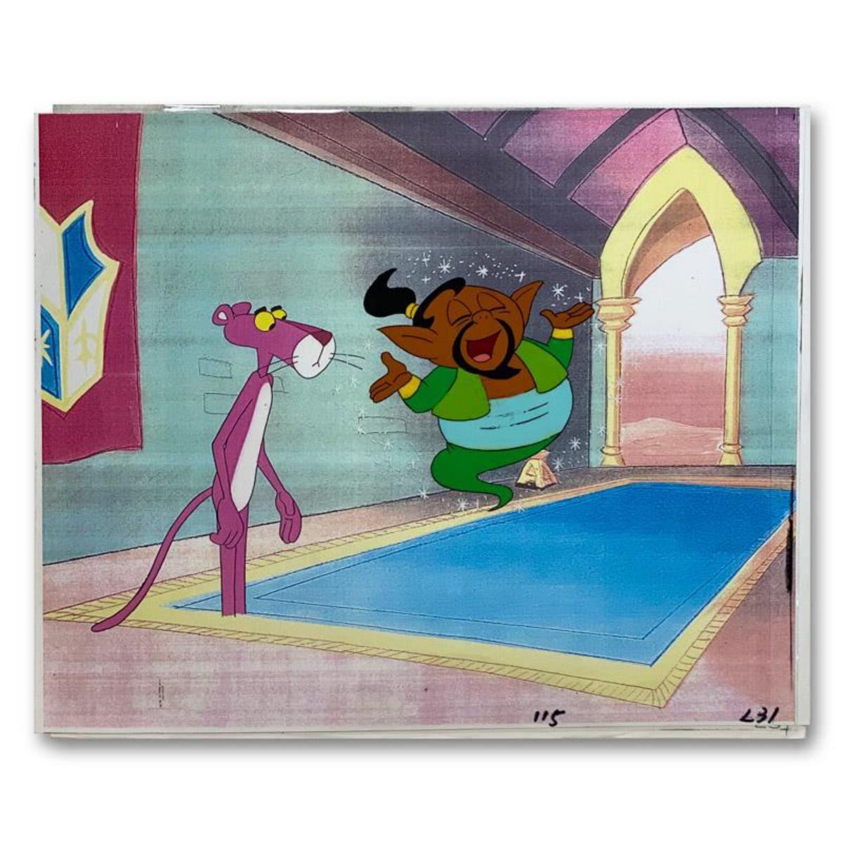 This is original production art used in the classic animated series The Pink Panther Show composed of a hand painted production cel, a printed background, and production sketch. Includes includes letter of authenticity. Measures approx. 12.5" x 10.5" (background). Reference #: 233091