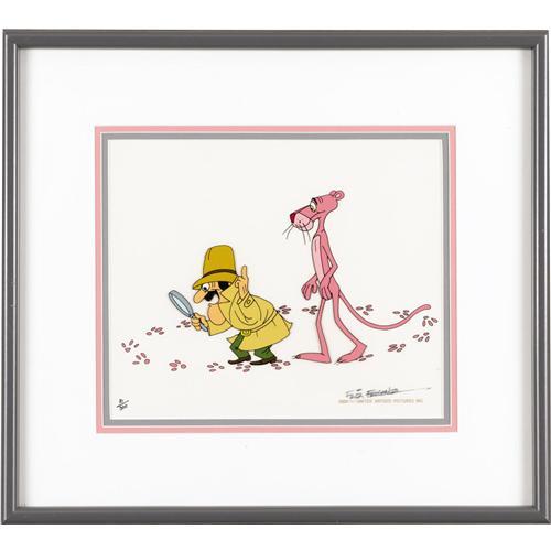 <B>The Pink Panther and the Inspector "Sleuthing" Limited Edition Hand Painted Cel #10/300 (United Artists Pictures, 1988).</B></I> The Pink Panther's got the Inspector going around in pink circles, in this first hand painted Pink Panther limited edition cel. Signed by Friz Freleng, the legendary Warner Bros. and Depatie-Freleng animation director, the image area measures 11.75" x 9.5". Matted and framed and in Excellent condition. Signed by Friz Freleng at the bottom right. Does not include a certificate of authenticity.<BR><BR><b>Shipping:</b> Framed (<a target="_blank" href="http://www.heritageauctions.com/common/shipping.php">view shipping information</a>)