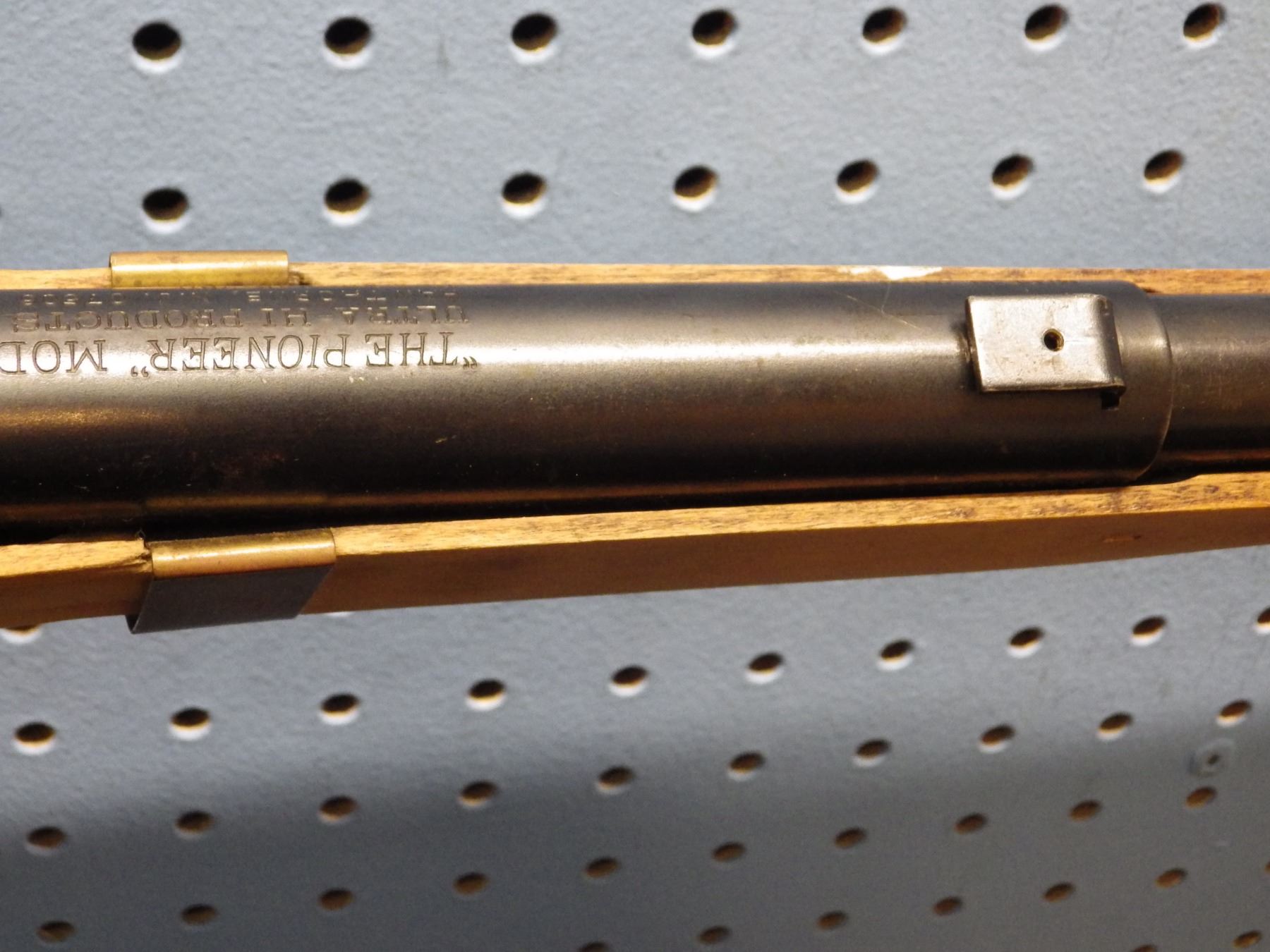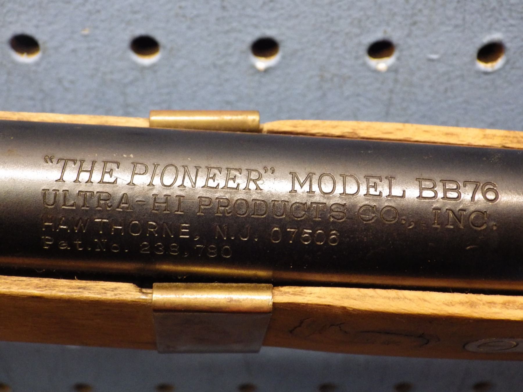 " The Pioneer ", Model BB76, BB Air Gun, PLASTIC PERCUSSION HAMMER BROKE, MISSING PARTS, made by Ultra - High Products Co., made in Japan, Serial number N2547. It is a 50-shot repeating spring-piston BB gun that cocks via a concealed underlever.
