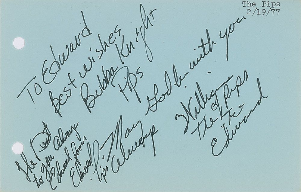 Felt tip signatures and inscriptions, “To Edward, Best wishes, Bubba Knight, Pips,” “The Best to you always Edward, from Edward, Pips,” “May God be with you always, William of the Pips,” on a light blue 6 x 4 album page. In fine condition, with punch holes to left edge.