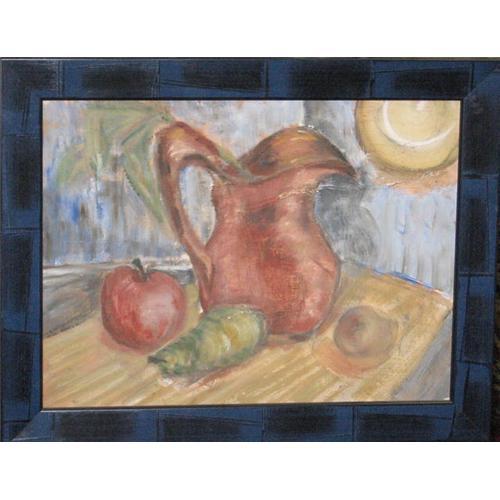 Original still life painting. Oil on canvas. Shows a pitcher and fruit on a table. It is a delightful image that has great color and energy. It is framed in an elegant contemporary black wood frame. It is in great condition. The total size is 19'x15'