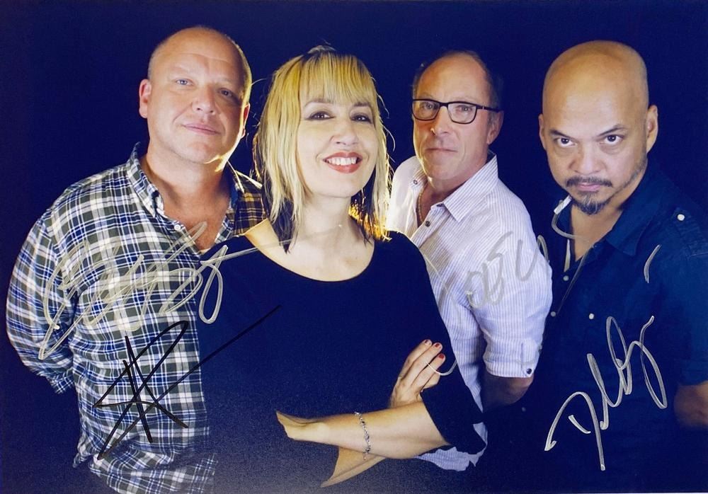 The Pixies band facsimile facsimile signed photo autographed by Francis Black, Kim Shattuck, David Lovering and Joey Santiago. 8x10 inches. This item is a reprint of an original autograph