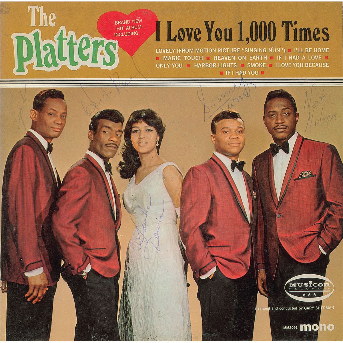 I Love You 1,000 Times album signed on the front cover in blue ballpoint by David Lynch, Herb Reed, Sonny Turner, Nate Nelson, and Sandra Dawn. In fine condition, with a small spot of adhesive remnant to top left corner. The record is included.