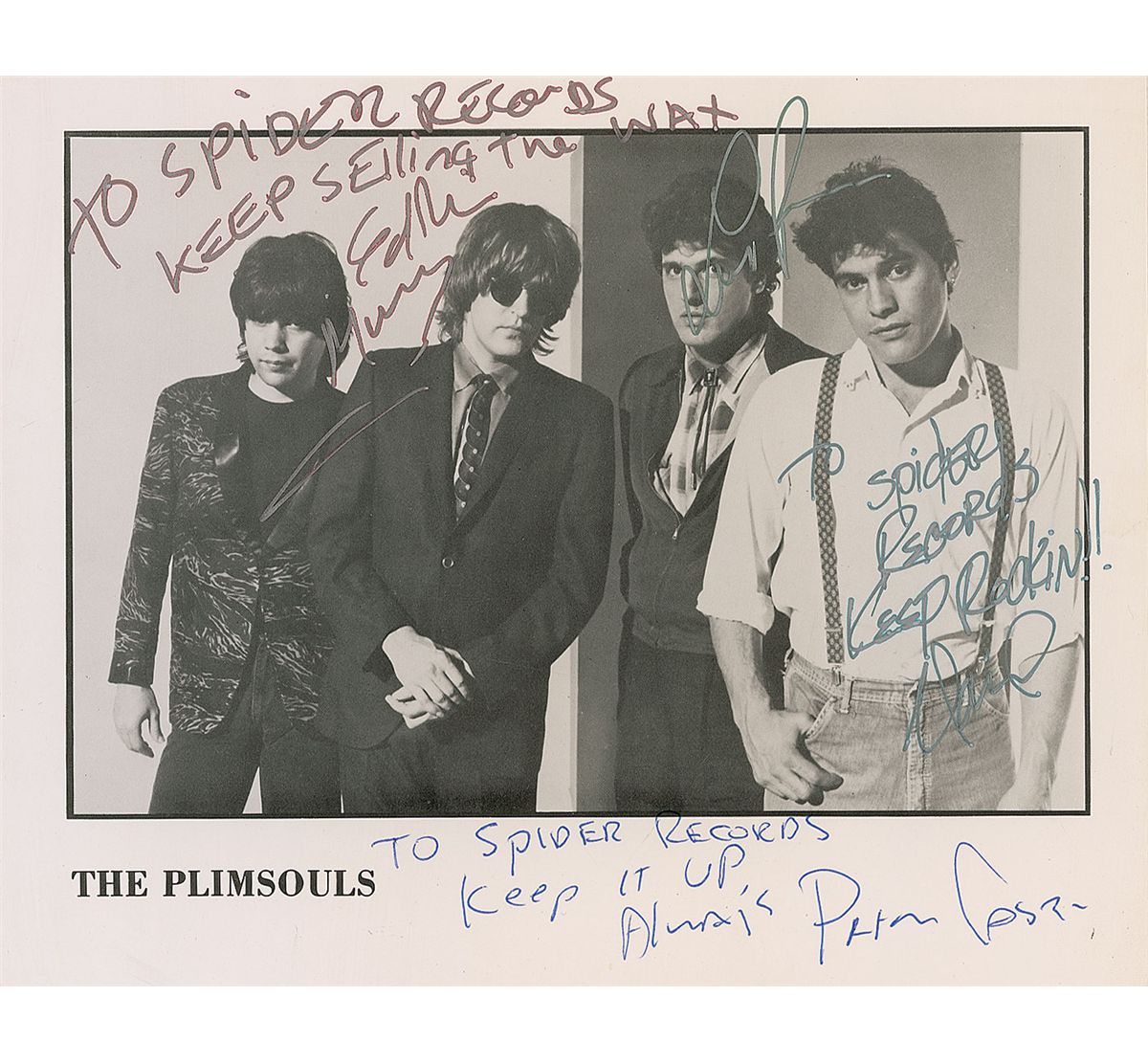California-based rock band who rose to national popularity when their song ‘A Million Miles Away’ appeared on the Valley Girls soundtrack. Cardstock 10 x 8 publicity group photo, signed and inscribed in silver ink and blue ballpoint to Spider Records by Peter Case, Eddie Munoz, Louie Ramirez, and David Pahoa. In fine condition.