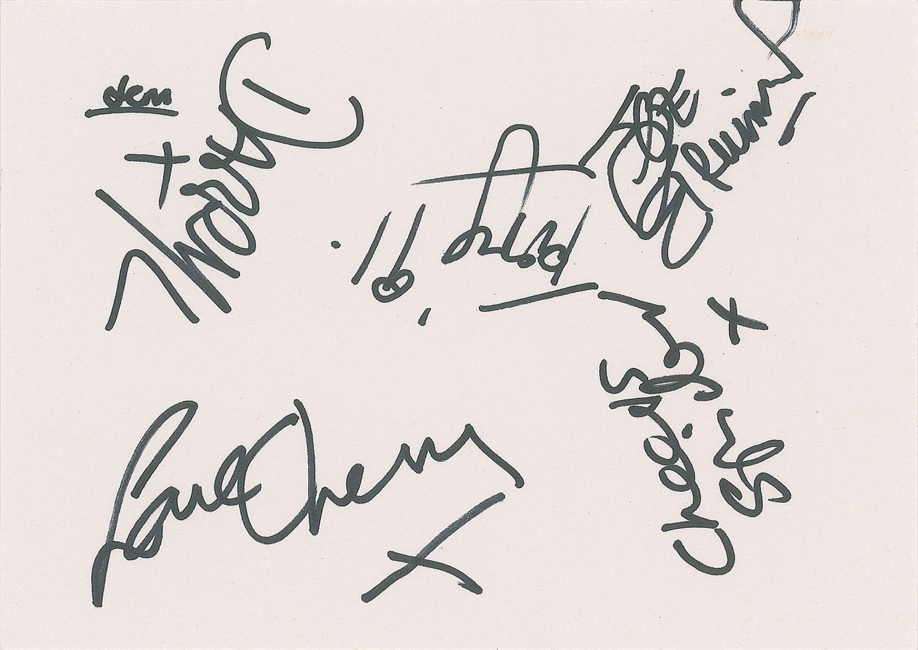 Felt tip signatures, "Phil Chevron, x," "Terry [Woods] '91," "Cheers, Spider [Stacy] x," "Darryl [Hunt] x," "Joe Strummer," and "Jem [Finer]," on a white 5.75 x 4 card. In fine condition.