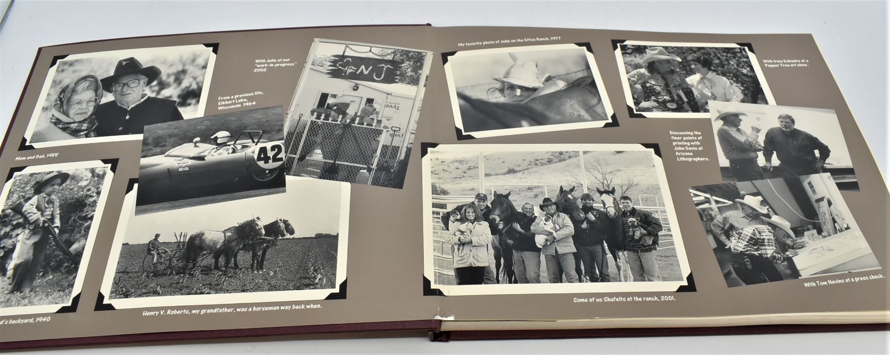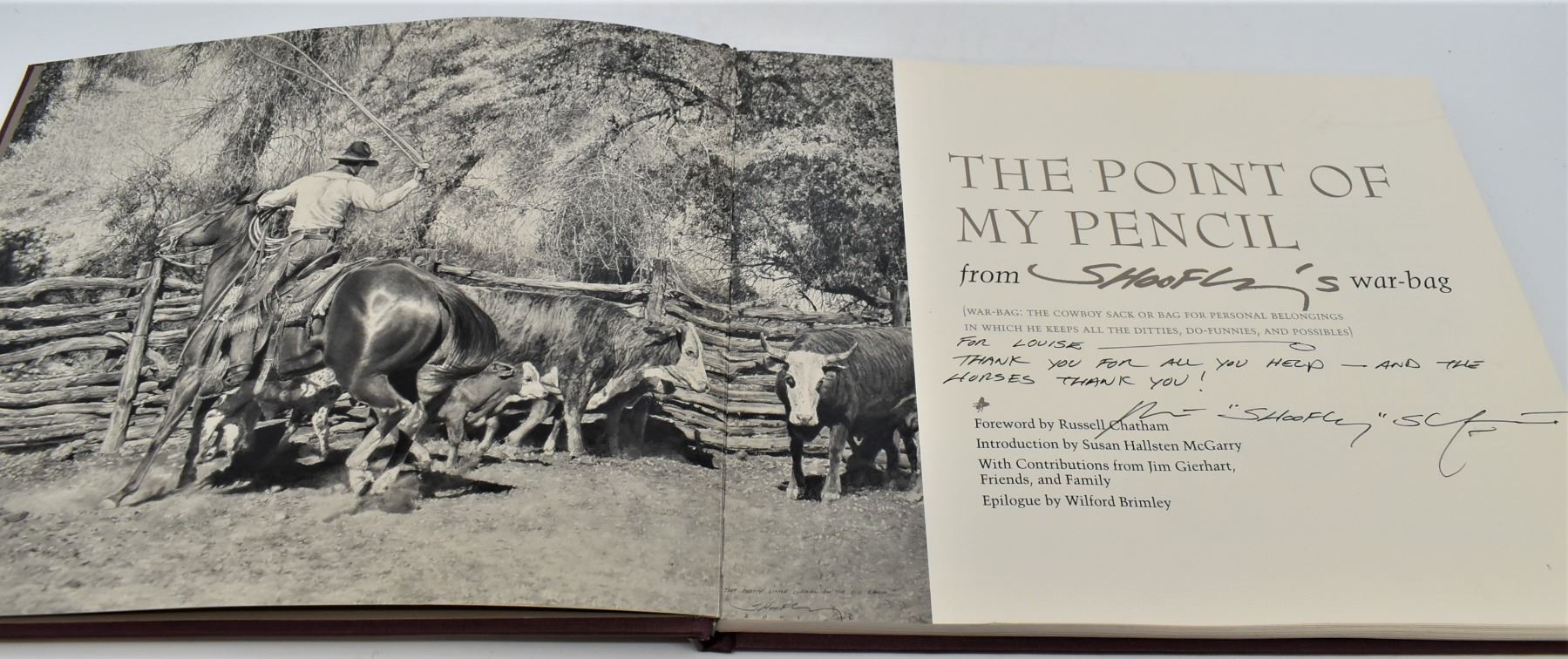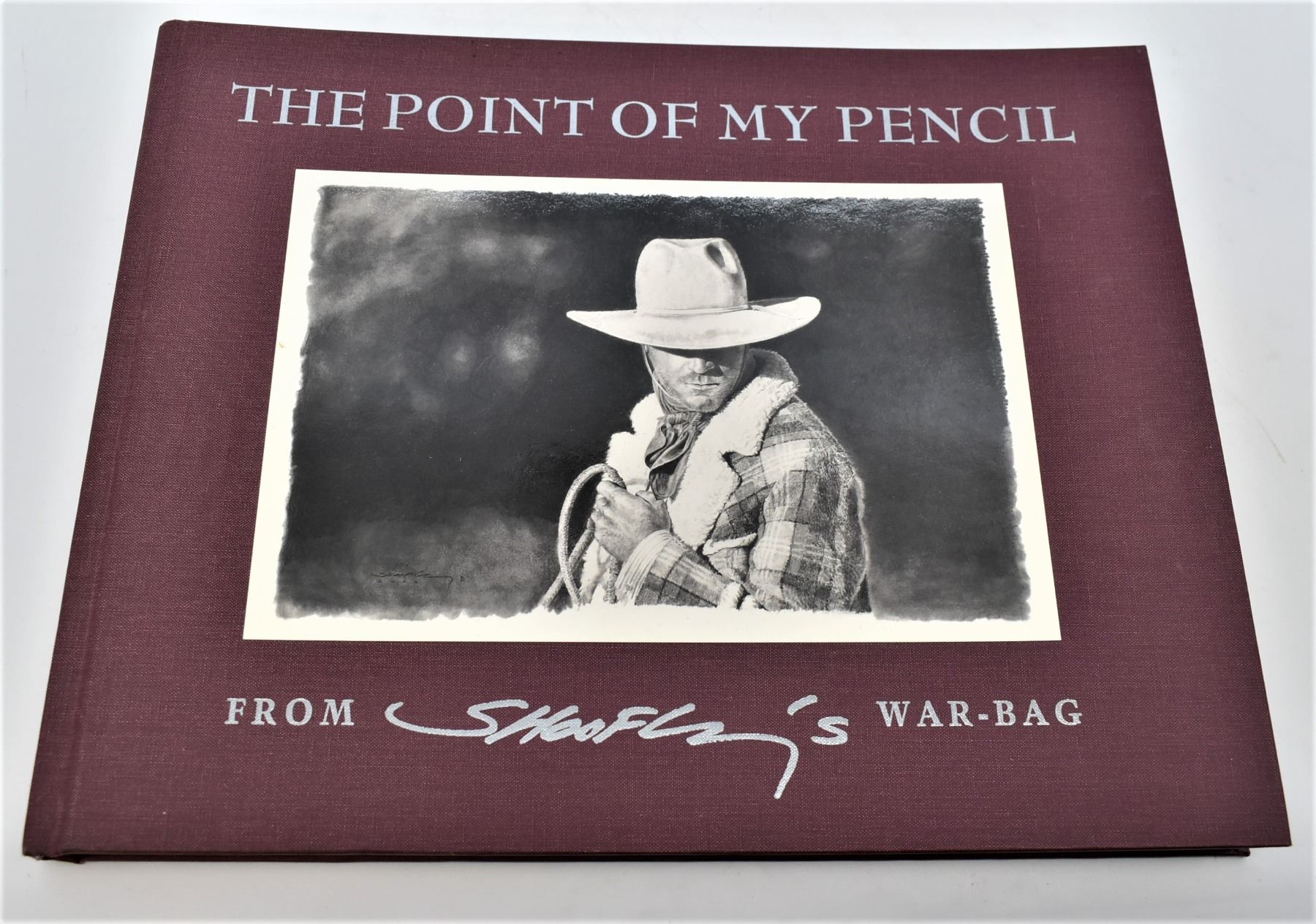 The Point of My Pencil From Shoofly's War Bag (War - Bag: The cowboy sack or bag for personal belongs in which he keeps all the itties, do-funnies, and possibles), hardback book, Foreword by Russell Chatham, Introduction by Susan Halsten McGarry, With Contributions from Jim Gierhart, Friends, and family, Epilogue by Wilford Brimley, c. 2002, special message to consignor from Robert ''Shoofly'' Shufelt, consignor did chiropractic work on his horses, fabulous book with incredible ''Shoofly'' art, book measures 12.25'' x 10''