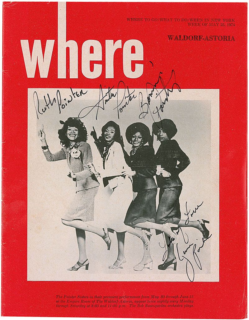 Original red program from The Pointer Sisters performance of Where to Go/What to Do/When in New York at the Waldorf-Astoria from May 30 through June 15, 1974, 8.5 x 11, signed in black felt tip by Ruth, Anita, Bonnie, and June, who adds, “Lots of Love.” Light surface creasing and wear, a small tear to the top left corner, and toning and foxing to the pages, otherwise fine condition.