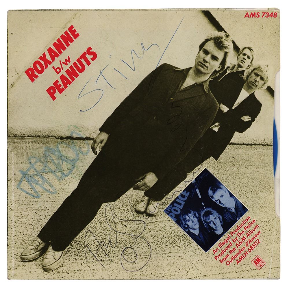 A&M Records 45 RPM single record for 'Roxanne / Peanuts' by The Police, signed on the back cover in ballpoint by Sting and Andy Summers, and in felt tip by Stewart Copeland. In fine condition. The blue vinyl record is included.
