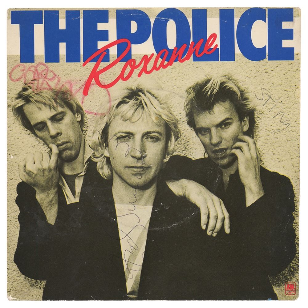 45 RPM record sleeve for the A&M Records single 'Roxanne / Peanuts' by The Police, signed on the front cover in black ballpoint by Andy Summer and Sting, and in red felt tip by Stewart Copeland. In fine condition, with usual rings of wear. The record is not included. Accompanied by a letter of provenance from the original recipient who notes that he obtained the signatures outside of a Virgin Records in Eldon Square on the single's release day in 1978.