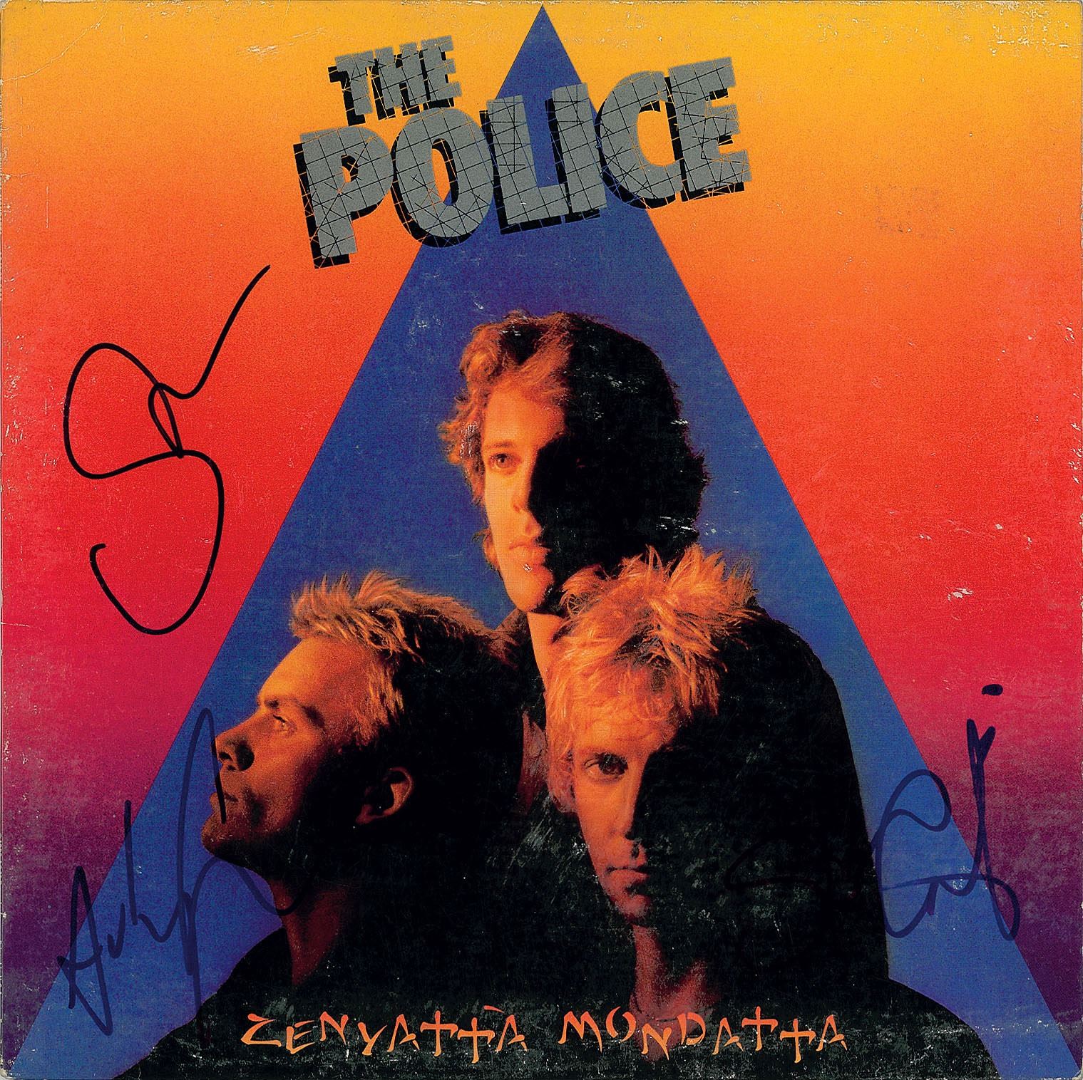Zenyatta Mondatta album signed on the front cover in blue felt tip by Sting, Andy Summers, and Stewart Copeland. In very good to fine condition, with light scuffing, gouging, and some old price sticker residue. The record is included. The album won two Grammy Awards including Best Rock Performance for 'Don't Stand So Close to Me' and Best Rock Instrumental Performance for 'Behind My Camel.'