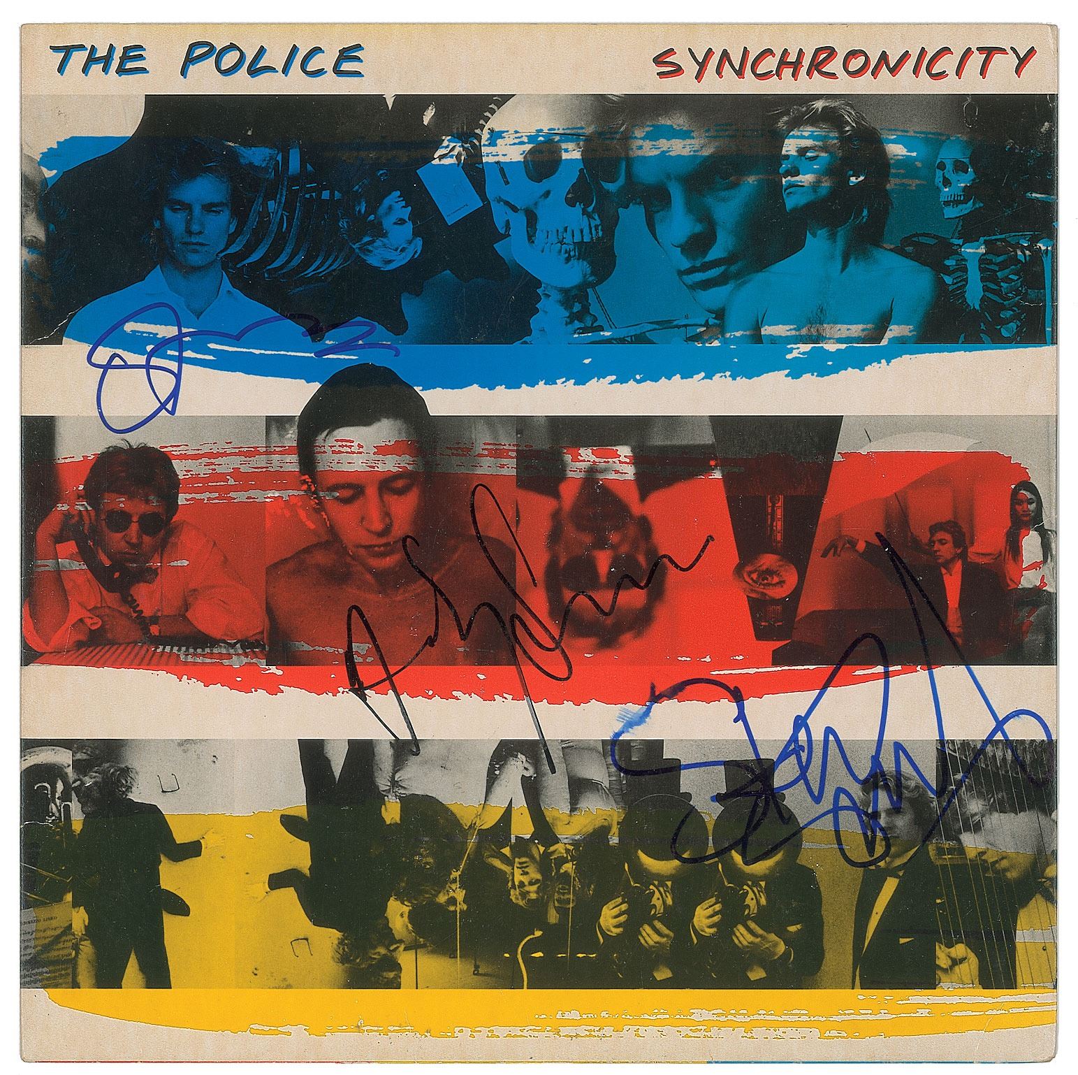 Synchronicity album signed in blue felt tip by Sting and Stewart Copeland, and in black felt tip by Andy Summer. In fine condition, with a light brush to Copeland's signature. The record is included. Featuring hit singles like 'Every Breath You Take' and 'Wrapped Around Your Finger,' Synchronicity is the band's most successful release, and an album that earned them three Grammys at the 1984 awards ceremony.