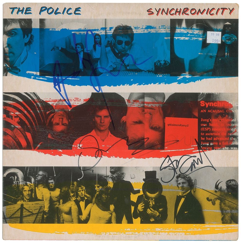 Synchronicity album by The Police, signed on the front cover in black felt tip by Sting and Stewart Copeland, and in blue felt tip by Andy Summers. In fine condition, with an affixed price sticker, and a short tear to the top edge. The record is included. Featuring hit singles like 'Every Breath You Take' and 'Wrapped Around Your Finger,' Synchronicity is the band's most successful release, and an album that earned them three Grammys at the 1984 awards ceremony. Accompanied by a John Brennan Collection letter of provenance.