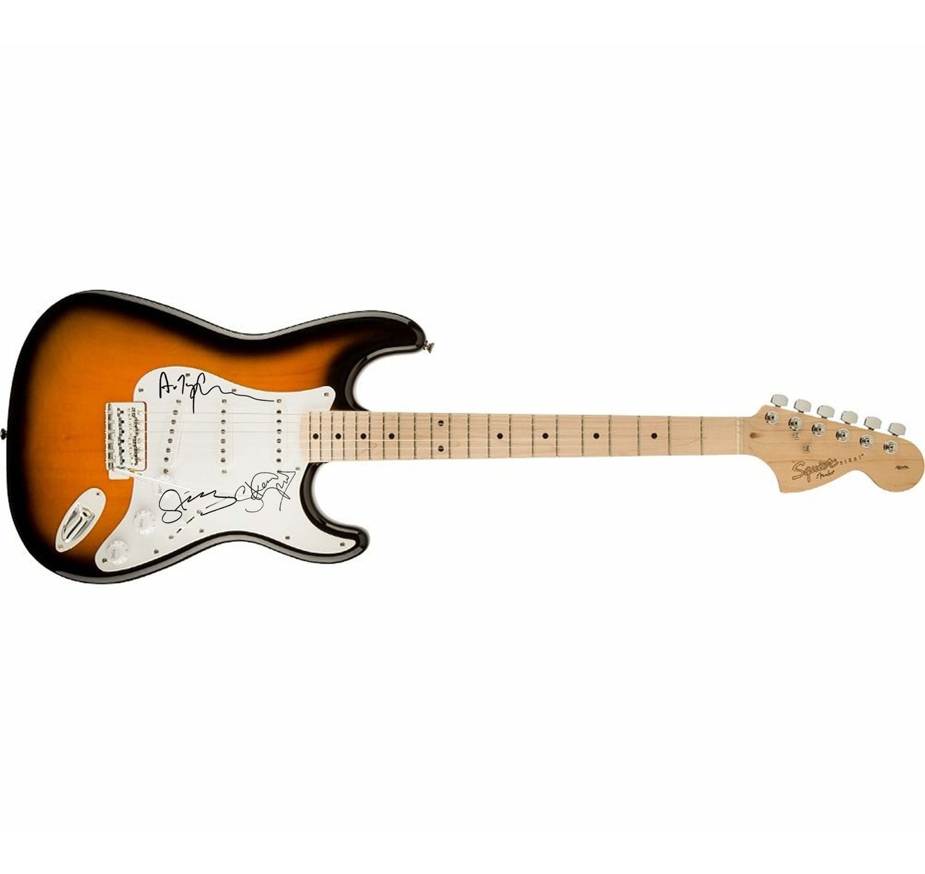 The Police signed sunburst strat style guitar autographed by Sting, Andy Summers and Stewart Copeland. Standard size