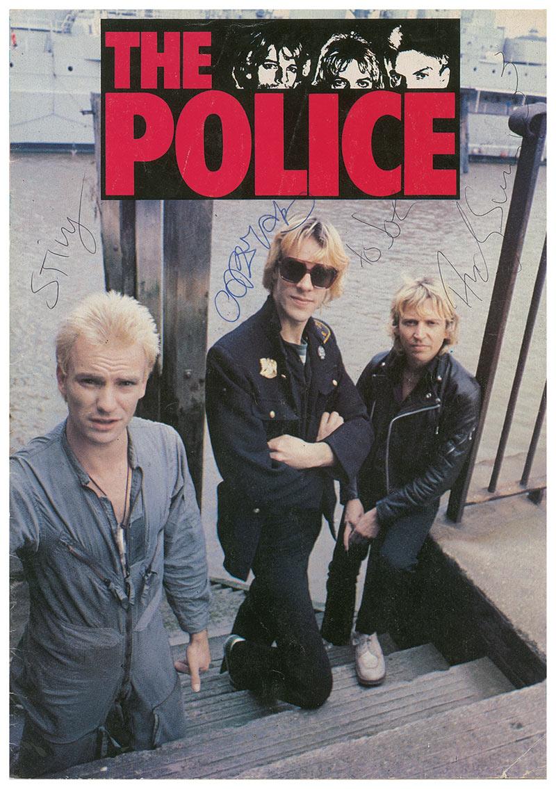 Vintage 1979 Police tour program, 8.25 x 11.5, signed on the front cover in black ballpoint by Sting and Andy Summers, who has inscribed to Joe, and in blue ballpoint by Stewart Copeland, also signed again by Sting on the inside back cover. Scattered creases and handling wear, some surface loss to back cover, and some light foxing to a few pages, otherwise fine condition. Accompanied by a ticket stub from a June 8, 1979, Police concert at the Free Trade Hall in Manchester—where all of the signatures were obtained—also signed on the back by Sting.