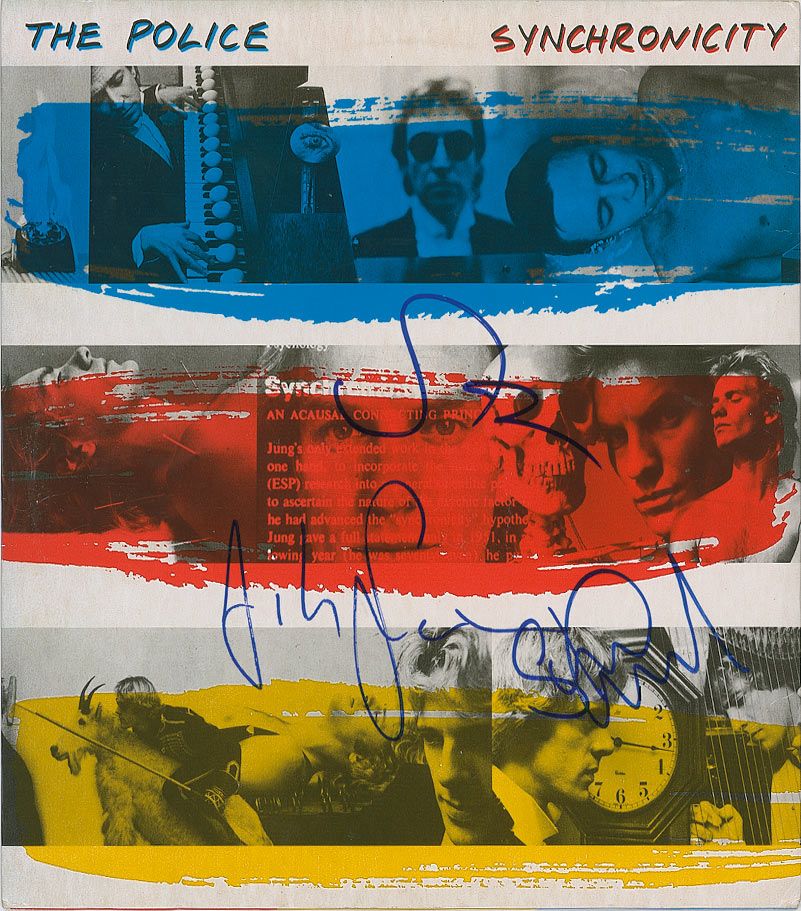 Synchronicity album signed on the front cover in blue felt tip by Sting, Andy Summers, and Stewart Copeland. In fine condition. The record is included. Accompanied by a letter of authenticity from James Spence.