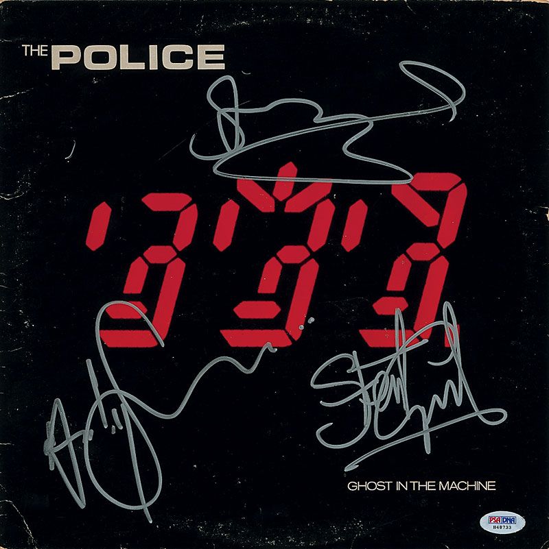 Ghost in the Machine album signed on the front cover in silver ink by Sting, Andy Summers, and Stewart Copeland. Scattered creasing to edges, a mild album impression, a PSA/DNA authentication label affixed to lower corner, and light surface loss to back cover, otherwise fine condition. The record is not included. Accompanied by a full letter of authenticity from Roger Epperson/REAL and a full letter of authenticity from PSA/DNA.