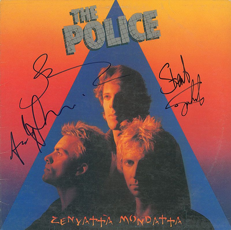 Zenyatta Mondatta album signed on the front cover in black felt tip by Sting, Andy Summers, and Stewart Copeland. In fine condition, with some edge creases and a mild ‘ring of wear’ to cover. The record is not included.