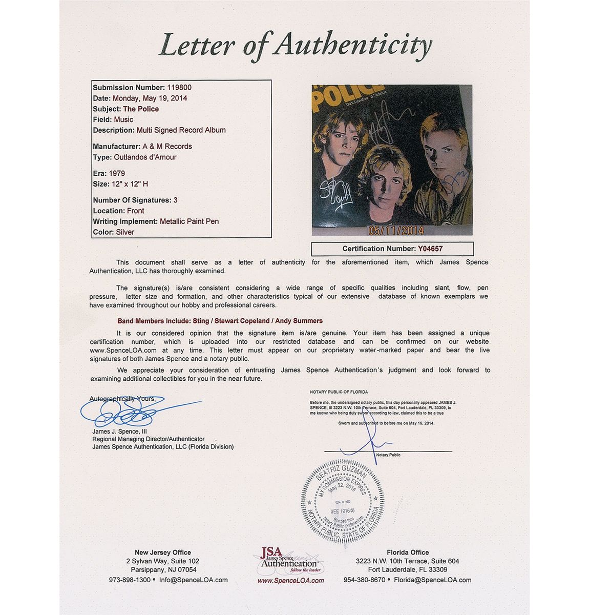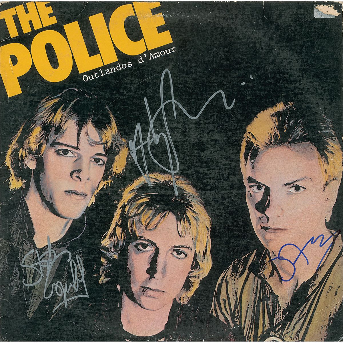 Outlandos d'Amour album signed on the front cover in blue felt tip and silver ink by Sting, Andy Summers, and Stewart Copeland. In very good condition, with edge and corner creases, scuffs and wear to edges, and surface loss and adhesive remnants to the upper right from price tag removal. The record is included. Accompanied by a full letter of authenticity from JSA.