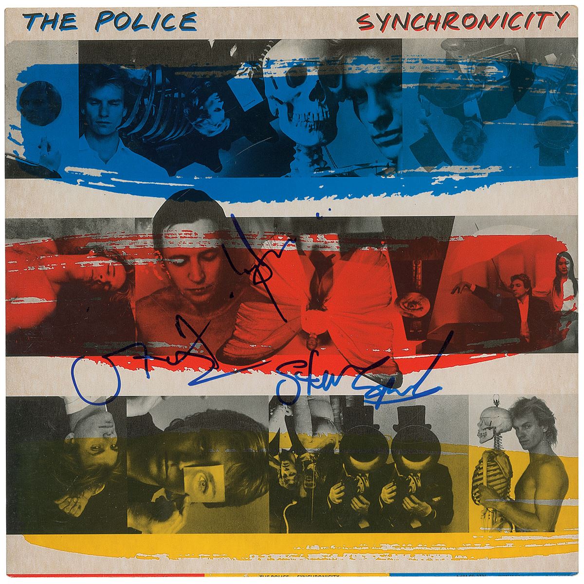 Synchronicity album signed on the front cover in blue felt tip by Sting, Andy Summers, and Stewart Copeland. In fine condition. The record is not included. Originally obtained by in-person specialist Mike Wehrmann.