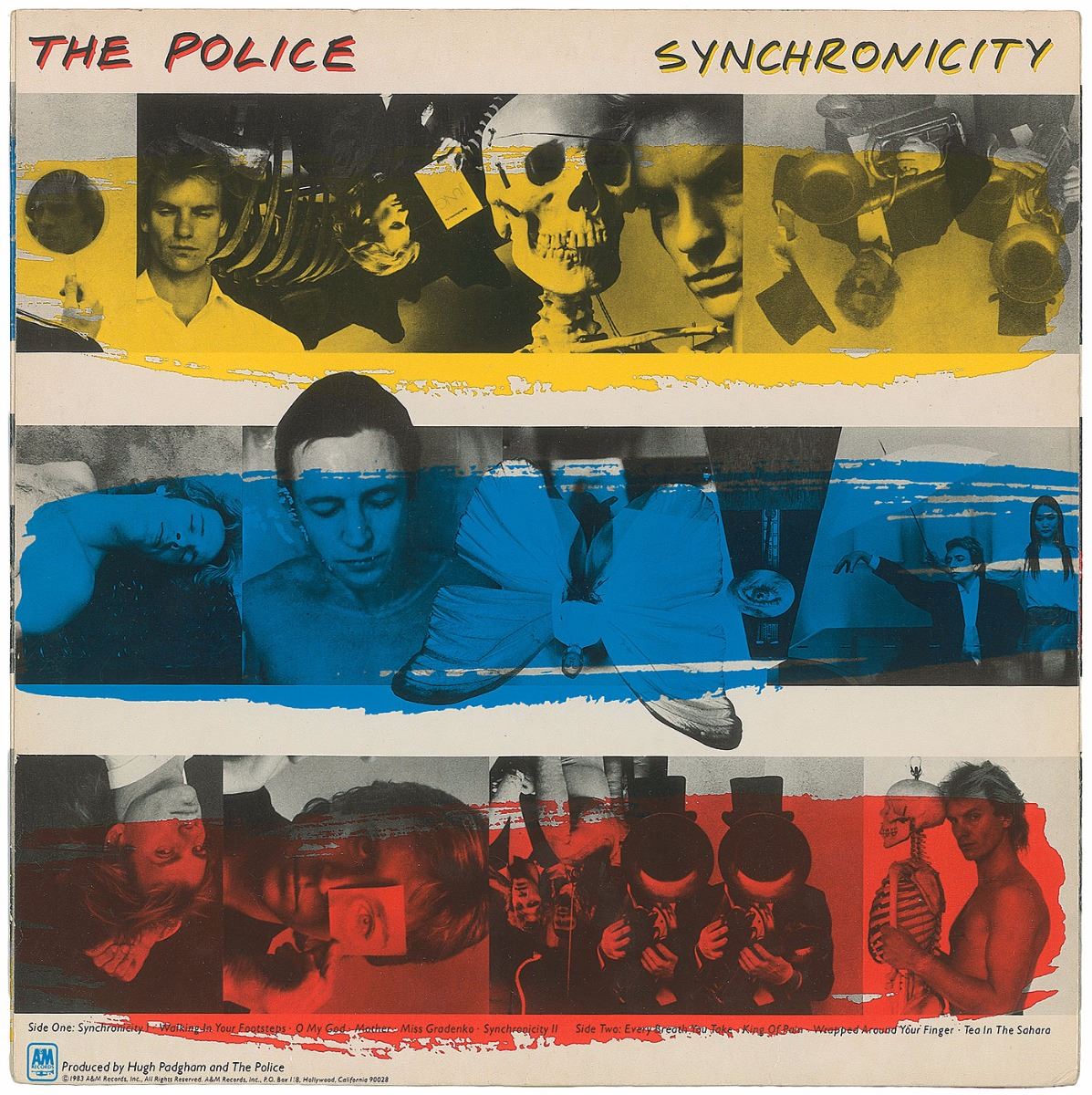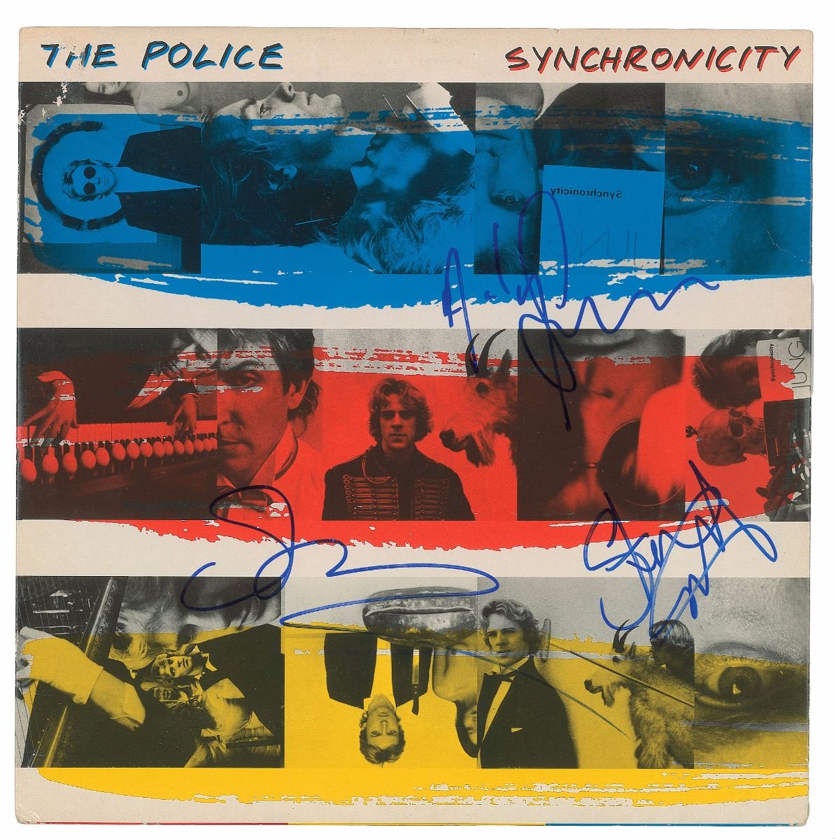 Synchronicity album signed on the front cover in blue felt tip by Sting, Andy Summers, and Stewart Copeland. In fine condition, with paper loss at upper left corner. The record is included. Consignor notes that the signatures were obtained in person.