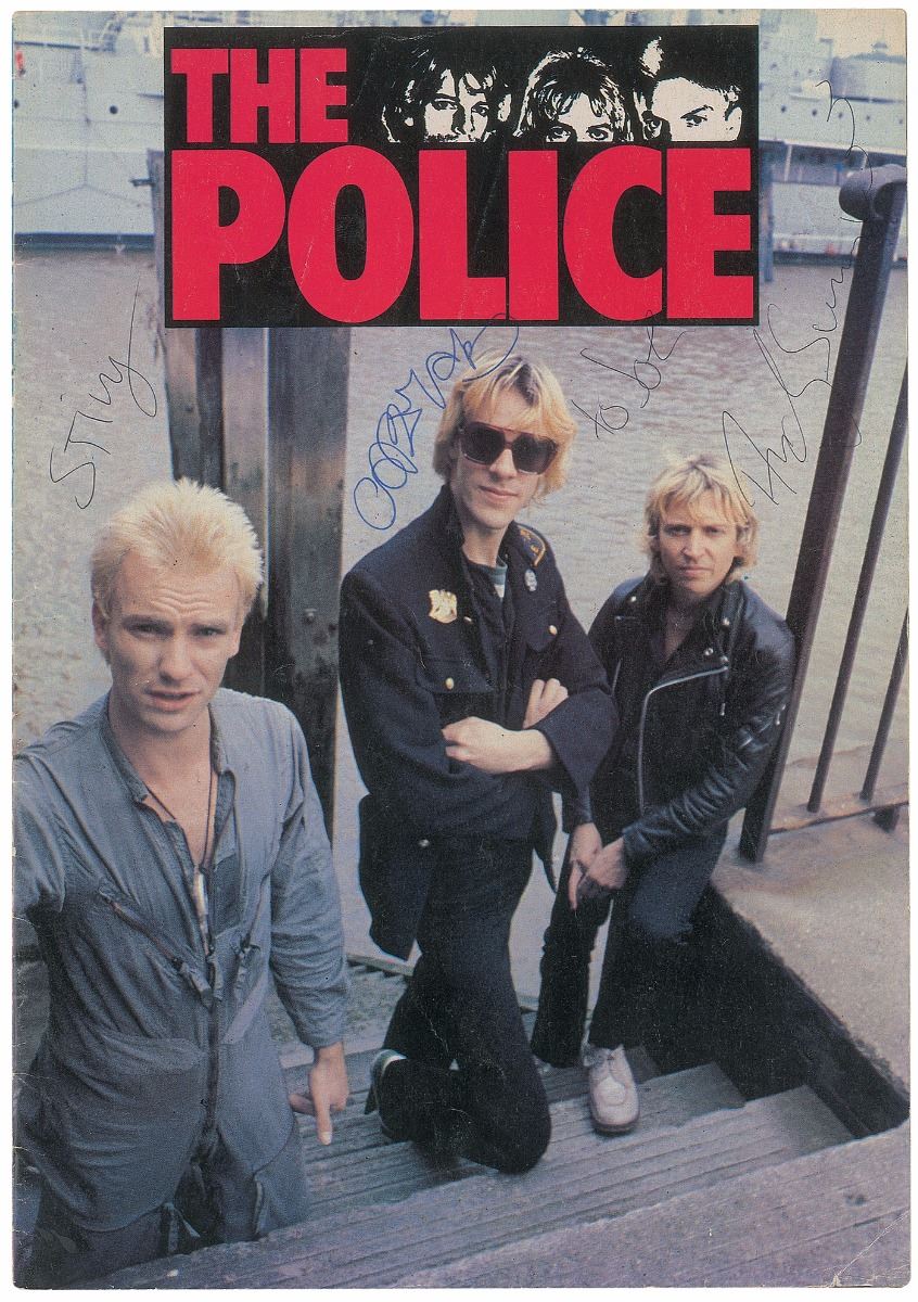Vintage 1979 Police tour program, 8.25 x 11.5, signed on the front cover in blue ballpoint by Stewart Copeland, and in black ballpoint by Sting and Andy Summers, who has inscribed “to Joe,” also signed twice more by Sting on the inside back cover. Scattered creases and handling wear, some surface loss to back cover, and some light foxing to a few pages, otherwise fine condition. Accompanied by a ticket stub from a June 8, 1979, Police concert at the Free Trade Hall in Manchester—where all of the signatures were obtained—signed on the back by Sting. Also accompanied by a full letter of authenticity from REAL.