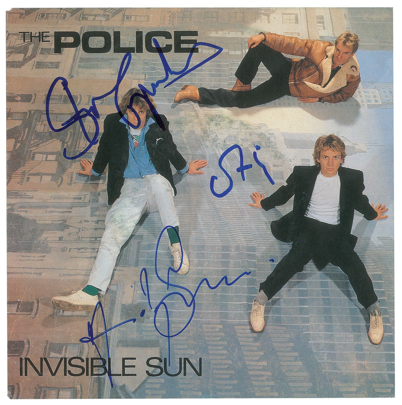A&M Records 45 RPM record for The Police single 'Invisible Sun / Flexible Strategies,' signed on the front cover in blue felt tip by Stewart Copeland, Andy Summer, and Sting. In fine condition. The record is included.