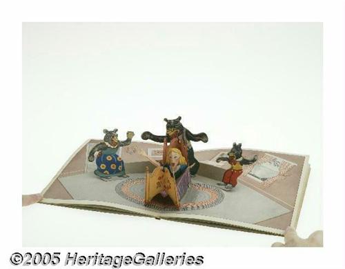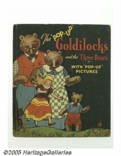 <B>The "Pop-Up" Goldilocks and the Three Bears (Blue Ribbon Books, 1934).</B></I> The predominantly black coloring on the cover made this a tough one to find in nice shape. This one is nice and flat (no cover warping), with some spine/corner and edge wear. Lightly penciled name on yellow part of Goldilocks' skirt, some cover scuffing and a couple of small spots -- one on Papa Bear's check and another just below word "Three"on cover. Life without this one could prove to be "unbearable". Has three complete pop-ups. Overall condition is Fine. <I>From the Larry Jacobs Collection.</B></I>