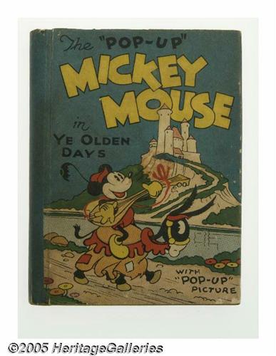 <B>The "Pop-Up" Mickey Mouse in Ye Olden Days - The Midget Pop-Up Book (Blue Ribbon Company, 1934) Condition: FN.</B></I> This 1934 book features a lovely pop-up and is one of Mickey's most elusive adventures. With a guest appearance by "Prince Addlepate" (Goofy), it's a surprise that the Round Table survived Mickey! There is a small scuff at left base of castle on back cover, some scuffing, few edge nicks, overall light wear. <I>From the Larry Jacobs Collection.</B></I>