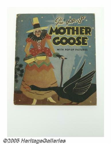 <B>The "Pop-Up" Mother Goose (Blue Ribbon Press, 1934).</B></I> Students of children's literature, illustration history, and historic books will certainly appreciate this classic edition of Mother Goose, <B>The Pop-Up Mother Goose</B></I>, with illustrations by Harold B. Lentz. Uncommon among early children's books, this volume has clean covers, tight pages, and a sharp corners. Plus the vulnerable (and delightful) Pop-Ups are intact and working. This slim volume features sixteen well-known Mother Goose rhymes. The text has many black and white illustrations and three double-page color Pop-Up scenes (flying mother goose, blackbirds in a pie, and Humpty Dumpty). In overall Very Good condition. <I>From the Larry Jacobs Collection.</B></I>