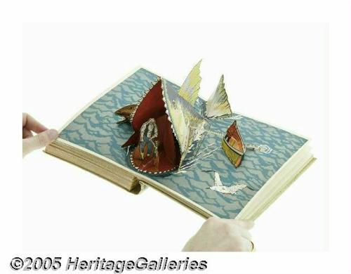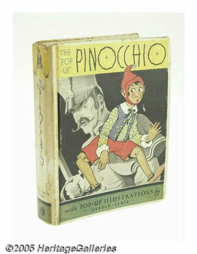 <B>The "Pop-Up" Pinocchio (Blue Ribbon Books, 1932).</B></I> While most of the world seems to believe that Pinocchio was created by Walt Disney, this large Blue Ribbon Pop-Up book from 1932 is testimony to the fact that our favorite wooden-nosed character had a proud existence before Uncle Walt. All four of the pop-ups are complete, and the thick stock used internally remains in great shape. Binding is solid. The covers do show wear to extremities, and there is some restoration work on the spine. A very desirable copy of a delightful pop-up book. <I>From the Larry Jacobs Collection.</B></I>