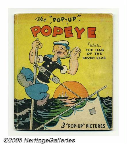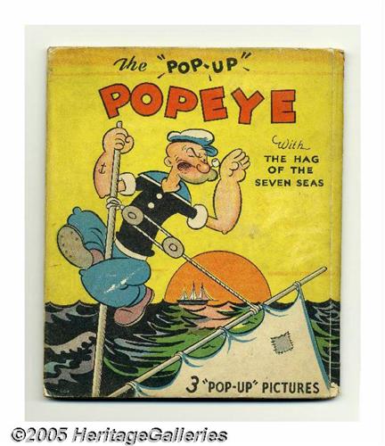 <B>The "Pop-Up" Popeye With the Hag of the Seven Seas (Blue Ribbon Books, 1935).</B></I> Elzie Segar's Popeye stood side-by-side with Mickey Mouse in terms of his popularity in the early 1930s. Featuring both the Sea Hag and her Goon, this copy has a small taped area on the third Pop-Up; there is some spine/corner chipping, edge wear, some scuffing, and small area of pencil erasure on back cover -- overall light wear. Not a high grade copy -- but solid and good enough to "shiver me timbers". Has three pop-ups. This is the very same book that is pictured in Larry Jacobs' <B>Big Little Books A Collector's Reference & Value Guide</B></I>. <I>From the Larry Jacobs Collection.</B></I>