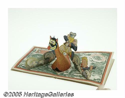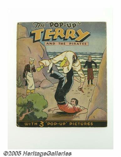 <B>The "Pop-Up" Terry and the Pirates (Blue Ribbon Books, 1935).</B></I> The mid-1930s line of Pop-Up books published by Blue Ribbon Books of Chicago has long been a collector favorite. Using both popular fairy tales and well-known comic strip characters of the time, the idea of actually seeing a three-dimensional picture "Pop-Up" from the printed page filled readers with delight during the Depression. The popularity of their line was quickly noticed by other publishers and pop-up books remain a mainstay of American publishing today. Although diligent collectors can eventually locate copies of most of Blue Ribbon's Pop-Up books (although some, the Mini Pop-Ups and the larger oversized volumes, are particularly elusive), copies often have spine damage, coloring, or missing Pop-Ups. The Larry Jacobs Collection features a complete set of all the Blue Ribbon Pop-Ups, each with Pop-Ups fully intact and no interior coloring. A challenge to collect and a joy to possess, few character-related collectibles from the 1930s are as attractive or desirable as the Blue Ribbon pop-up books. Issued in 1935, <B>The "Pop-Up" Terry and the Pirates</B></I> seems to surface with less frequency than many of the other volumes. The front cover reveals the shadowing of some careful tape removal along the spine, some spine/edge chipping, and corner wear. Few light interior spots. A solid collectible copy. Overall condition is Very Good. <I>From the Larry Jacobs Collection.</B></I>