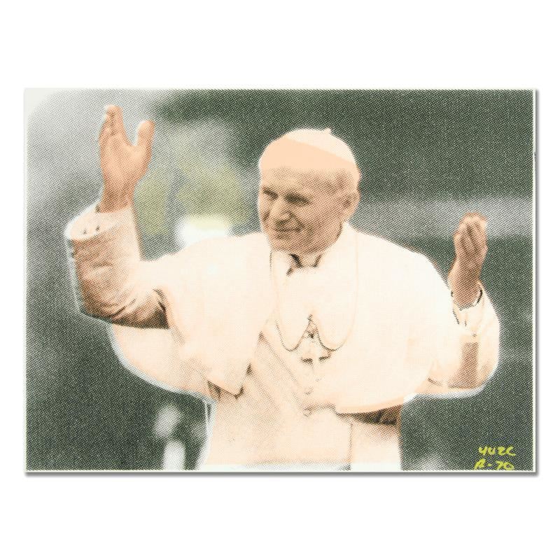 "The Pope" is a one-of-a-kind hand-pulled silkscreen and mixed media painting on canvas by Ringo - protege of Andy Warhol's apprentice, Steve Kaufman. This piece is hand signed by the artist and Includes Certificate of Authenticity. This piece comes from the Andy Warhol Legacy Series. Due to the nature of the canvas these, pieces will need to be mounted for framing. Measures approx. 16 x 12 (image).