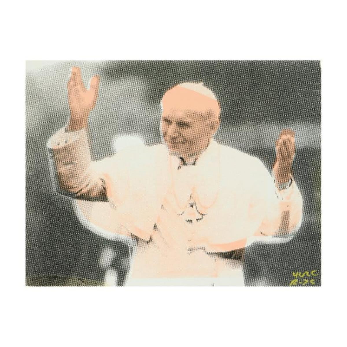 "The Pope" is a one-of-a-kind hand-pulled silkscreen on canvas by Ringo (Daniel Funes) - protege of Andy Warhol's apprentice, Steve Kaufman. This piece is hand signed by the artist and Includes Certificate of Authenticity. This piece comes from the Andy Warhol Legacy Series. Measures approx. 15" x 12" (image). Due to the nature of the canvas these, pieces will need to be mounted for framing. Also, there is a crease and small puncture mark on the bottom-right corner/edge that may be concealed when framed.