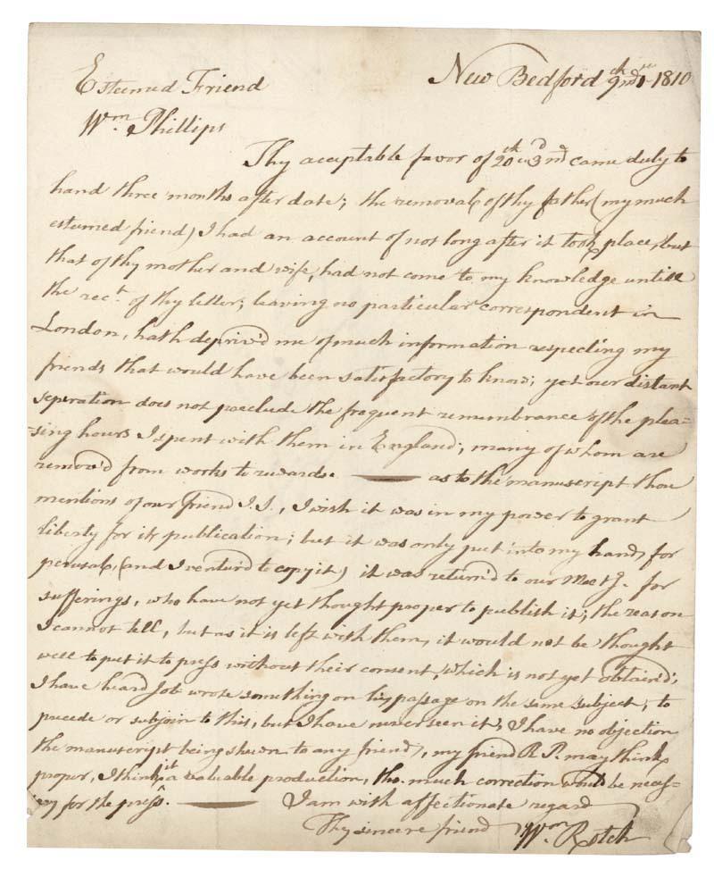 Autograph Letter Signed, "Wm. Rotch." One page, 7 3/4" x 9 5/8". New Bedford. December , 1810. Addressed on integral leaf. With circular "Ship Letter" and one other postal cancellation. Rotch writes, in part: : " ... The removal of thy father (my much esteemed friend) I had an account of not long after it took place, but that of thy mother and wife, had not come to my knowledge until the rect. of thy letter ... our distant separation does not preclude the frequent remembrance of the pleasing hours I spent with them in England; many of whom are removed from works to rewards - as to the manuscript thou mentions of our friend I.T. [?] I wish it was in my power to grant liberty for its publication ... it was returned to our Messrs [?] for sufferings who have not yet thought proper to publish it; the reason I cannot tell, but as it is left with them, it would not be thought well to put it to press without their consent ... I have no object the manuscript being shewn to any friend, … tho much correction would be necessary for the press ..." Paper loss from wax seal. Overall Very Fine.