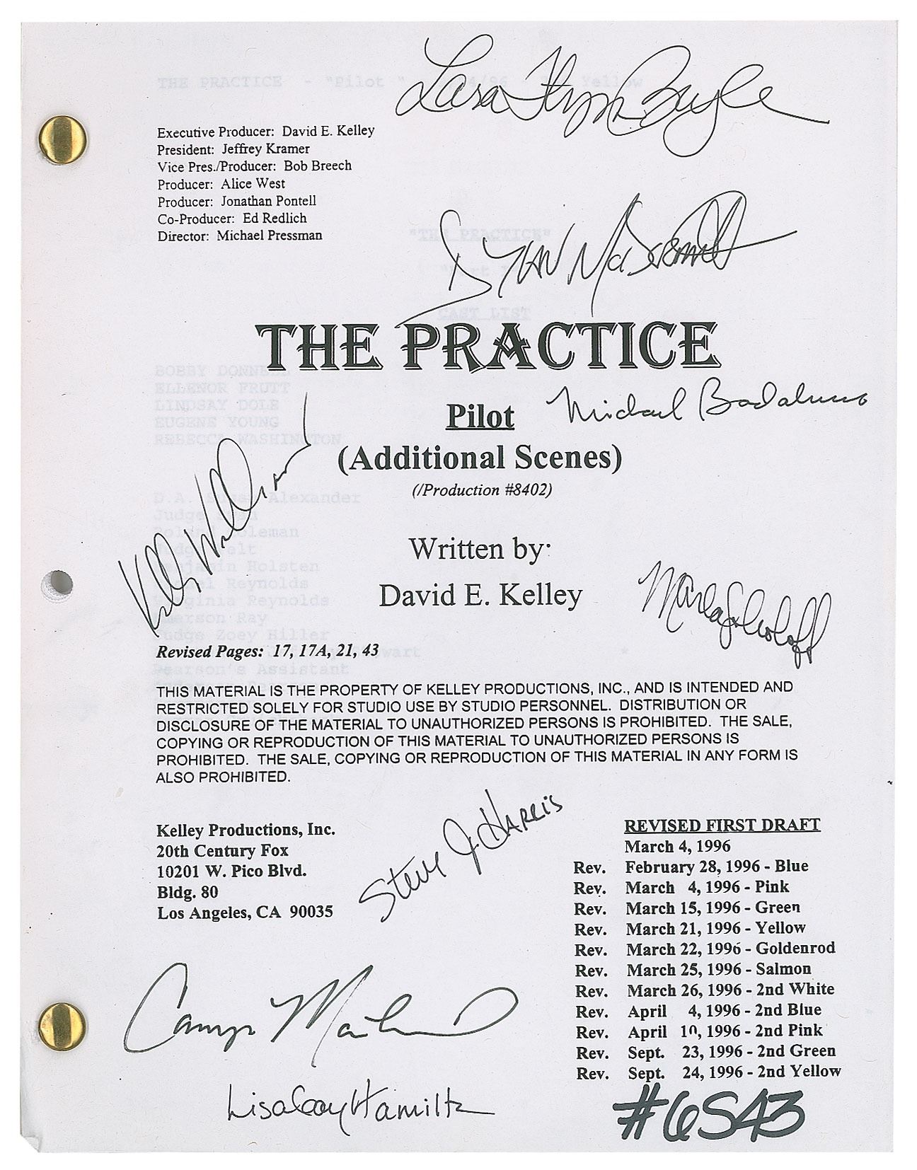 Brad-bound copy of the first draft script for the pilot episode of the legal drama The Practice, approximately 60 pages, 8.5 x 11, dated September 24, 1996, signed on the front cover in black felt tip by Dylan McDermott, Lara Flynn Boyle, LisaGay Hamilton, Michael Badalucco, Kelli Williams, Marla Sokoloff, Steve Harris, and Camryn Manheim. In fine condition, with some wear near cover punch holes.
