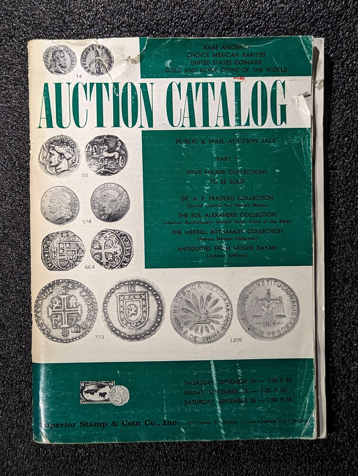 (1) Superior Stamp & Coin Co. Four Major Collections to be Sold. Dr. A.F. Pradeau Collection. The Sol Alexander Collection. The Merrill Bothamley Collection. Antiquities from Moshe Dayan. Part I. September 24-26, 1970. 1-2132 Lots. 8vo. Original pictorial card covers. Public Auction Sale. Los Angeles. 108 Pages. Photo supplement containing 52 b&w coin and medal plates. PRL. cover chipped, worn. Near Very Good. Ex Libris of Freeman Craig, Jr.