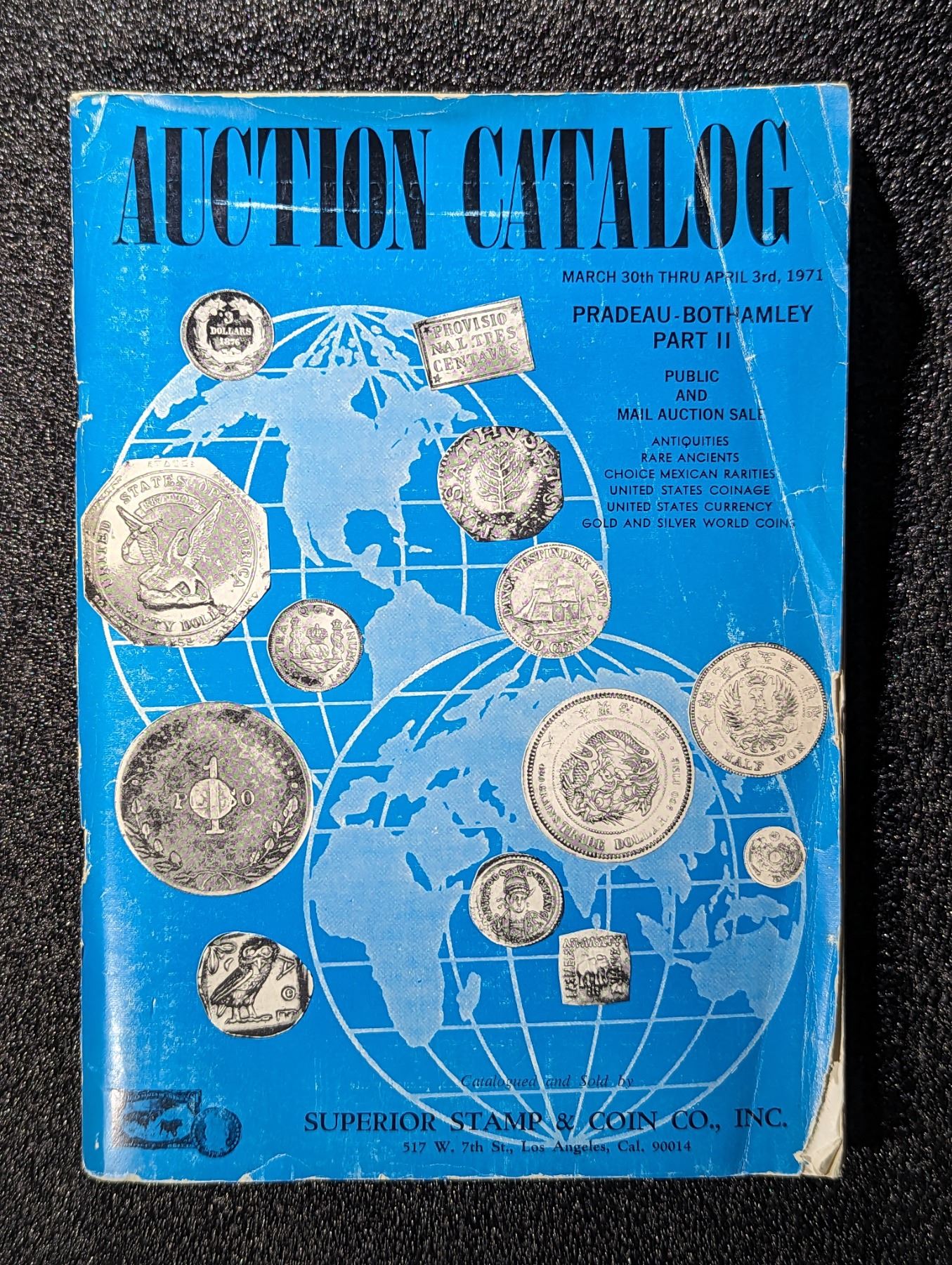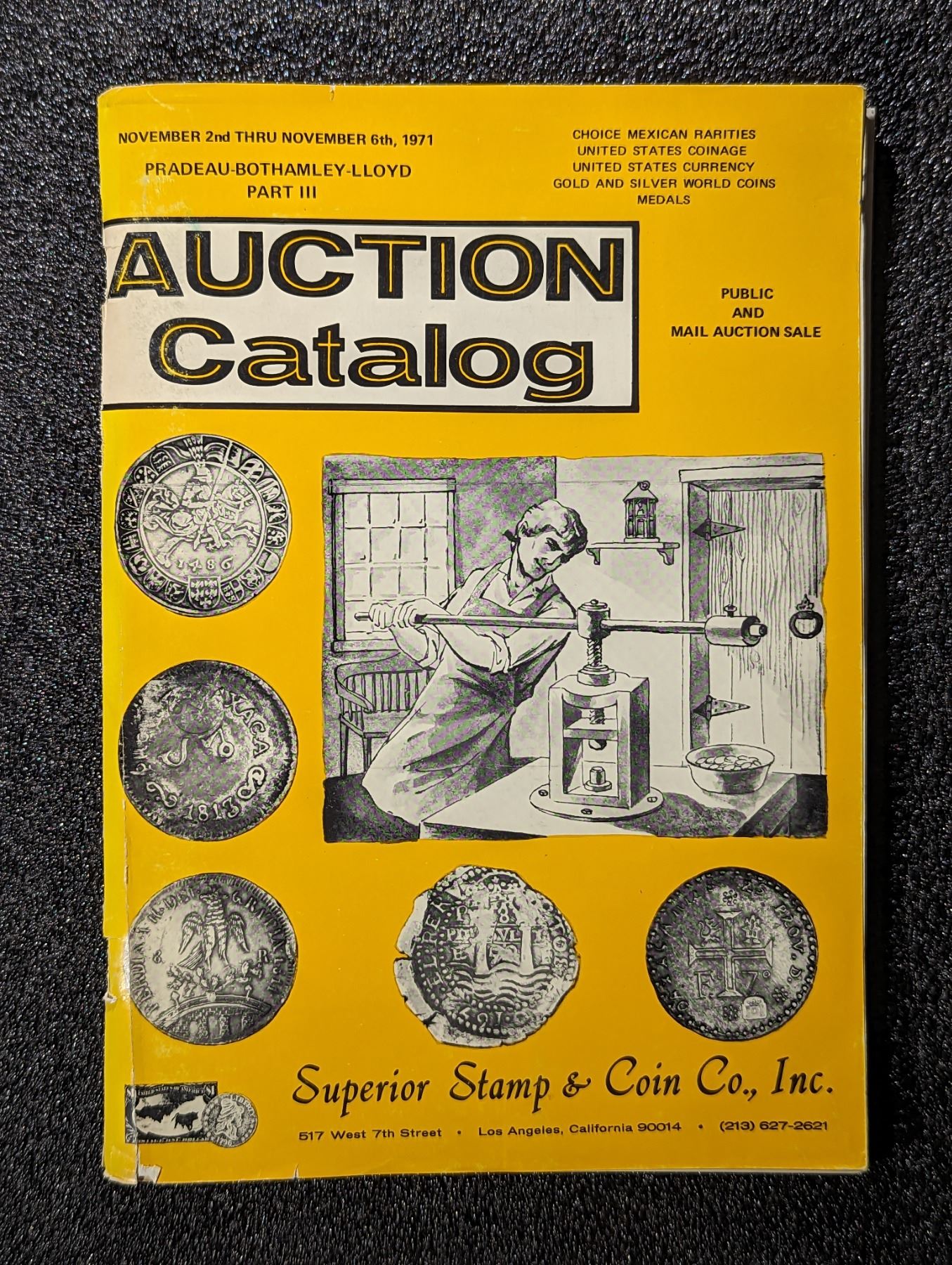 (3) Superior Stamp & Coin Co. Pradeau-Bothamley-Lloyd Part III. November 2-6, 1971. 1-1091 Lots. 8vo. Original pictorial card covers. Public Auction Sale. Los Angeles. 108 Pages. Photo supplement containing 48 b&w coin and currency plates. Very Good. Lot weight: 2 lbs 0oz. Subject(s): United States, Mexican, World Coinage, Paper Money.