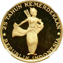 Indonesia. 10,000 Rupiah, 1970. Fr-3; KM-30. Weight 0.7141 ounce. Mintage 1,440. For the 25th Anniversary of Independence. Wayang dancer. NGC graded P