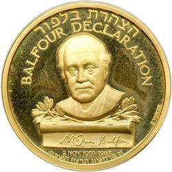Israel. State Gold Medal, 1967. 35 mm. 30 grams.917 fine. By Paul Vincze. 2,500 minted. Balfour Declaration Jubilee. Portrait of Lord Arthur James Bal