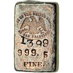 An old San Francisco Mint Silver Bar. Circa 1940's-1960's. 32 mm x 50 mm. 999.5 fine, 5.69 oz. #1399. Stamped with the San Francisco mint se...
