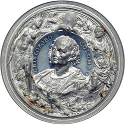 (1892-93) Christoforo Colombo E-107. NGC graded Medal MS-64 PL. White Metal. 58mm. World's Columbian Exposition. A sensational artistic depictio...
