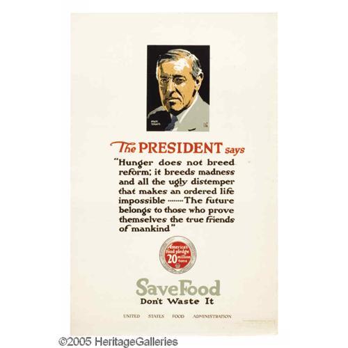 <B> The President Says: </B></I> (Lot of 2) 30" X 20" Artist: Adolph Triedler. Printed for the U.S. Food Administration. This poster features a small speech by President Woodrow Wilson. It promotes the American goal to export 20 million tons of foodstuffs overseas. This poster is very similar to one printed by the Food Administration featuring president Abraham Lincoln and a quote from him. The basic message of these posters was that if we as a people save a little bit, then the world which is suffering as a whole will benefit. Hunger makes civilized life difficult, and it was our goal overseas to restore order and make civilized life possible once again. A must have! <r<r Condition:<BR>Poster 1-Fine; dirt stains and residue on lower edge, rubbing of the ink in lower portion of the text,edges show minimal wear. <rPoster 2-Fine; cockling from severe fold memory, edges show normal wear from rolling.storage, dirt stains and residue on edges.