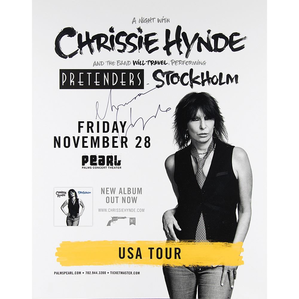 Attractive color 23 x 29.25 poster for a concert by Chrissie Hynde and the band Will Travel “performing Pretenders,” held at the Pearl Concert Theatre at the Palms Casino Resort in Las Vegas, Nevada, on November 28, 2014, signed prominently in black felt tip. Affixed to a same-size mount and in fine condition. The consignor notes that the autograph was obtained in person.