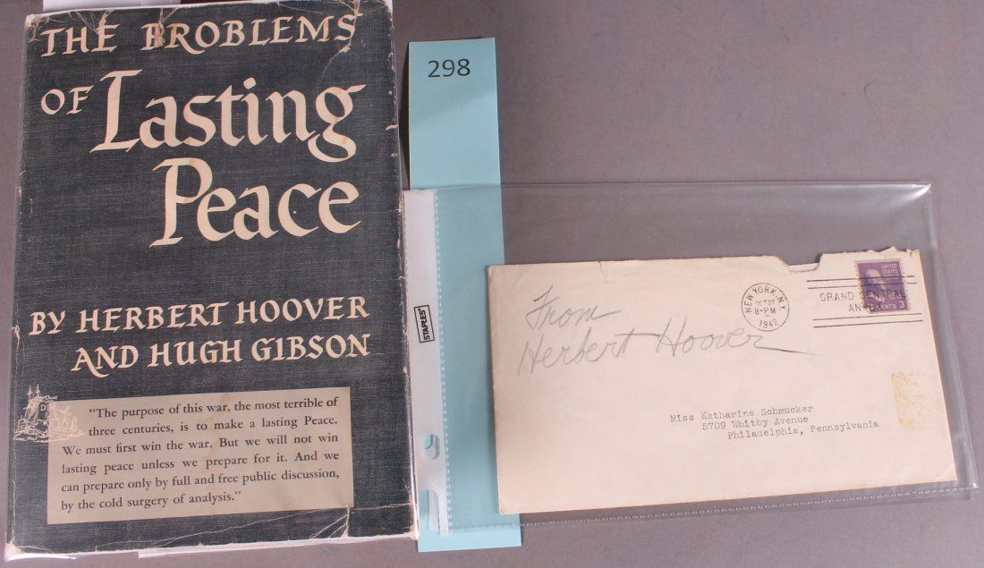[President Herbert Hoover]. Herbert Hoover and Hugh Gibson. THE PROBLEMS OF LASTING PEACE. Garden City, NY: Doubleday, Doran and Company, 1942. Front free ep signed and inscribed ?To Kathrine Schmucker/ With the kind Regards of Herbert Hoover.? Placed in is a TLS by Hoover, which reads ?That was a touching gift. And with growing grandsons to entertain and ?instruct?, it becomes a double gift./ I do want you to know how much I appreciate the friendship it shows. And not in exchange but in appreciation, I am sending you a little book of my own./ Yours faithfully, [signed] Herbert Hoover.? (On stationery with Hoover?s name at top center, typed date ?The Waldorf Astoria/ New York, New York/ October 26, 1942,? approx. 10 ?? x 7 ??, very good in original envelope).