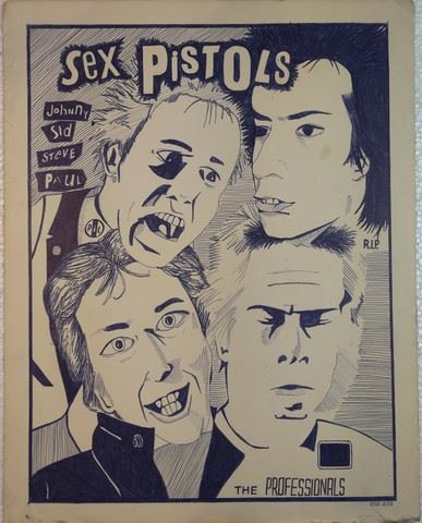 The Professionals (formed by ex-members of Sex Pistols) lobby card. Band members on cover include Sid Vicious, Johnny Rotten, Steve Jones, Paul Cook. Some edge wear, some creases, pin-holes, tape, stains. Fine. (11"x14").