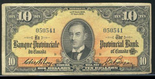 The Provincial Bank 1936 $10 615-18-06 050541 "Orange back" about VF.